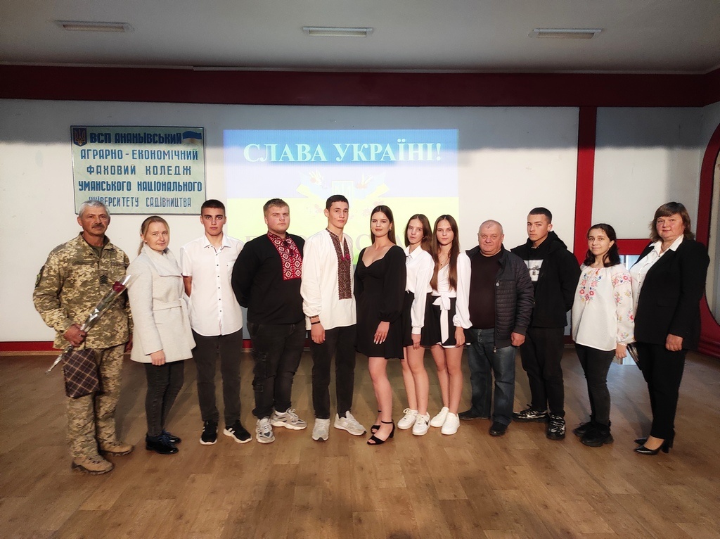 Сьогодні в Ананьївському аграрно-економічному фаховому коледжі відбувся виховний захід, присвячений Дню захисників і захисниць України. Його підготувала викладач Мишевська Людмила Петрівна разом зі студентами 22 групи, а також студентами 3 курсу – Стасюк Катериною, Версеник Катериною та Завідієм Дмитром.
