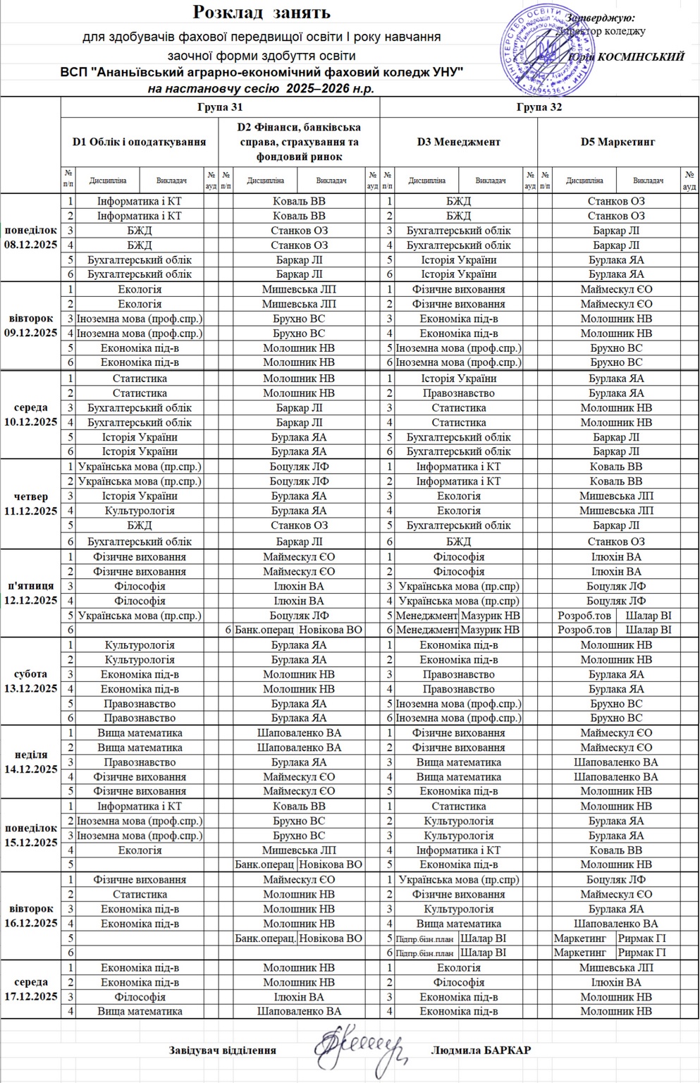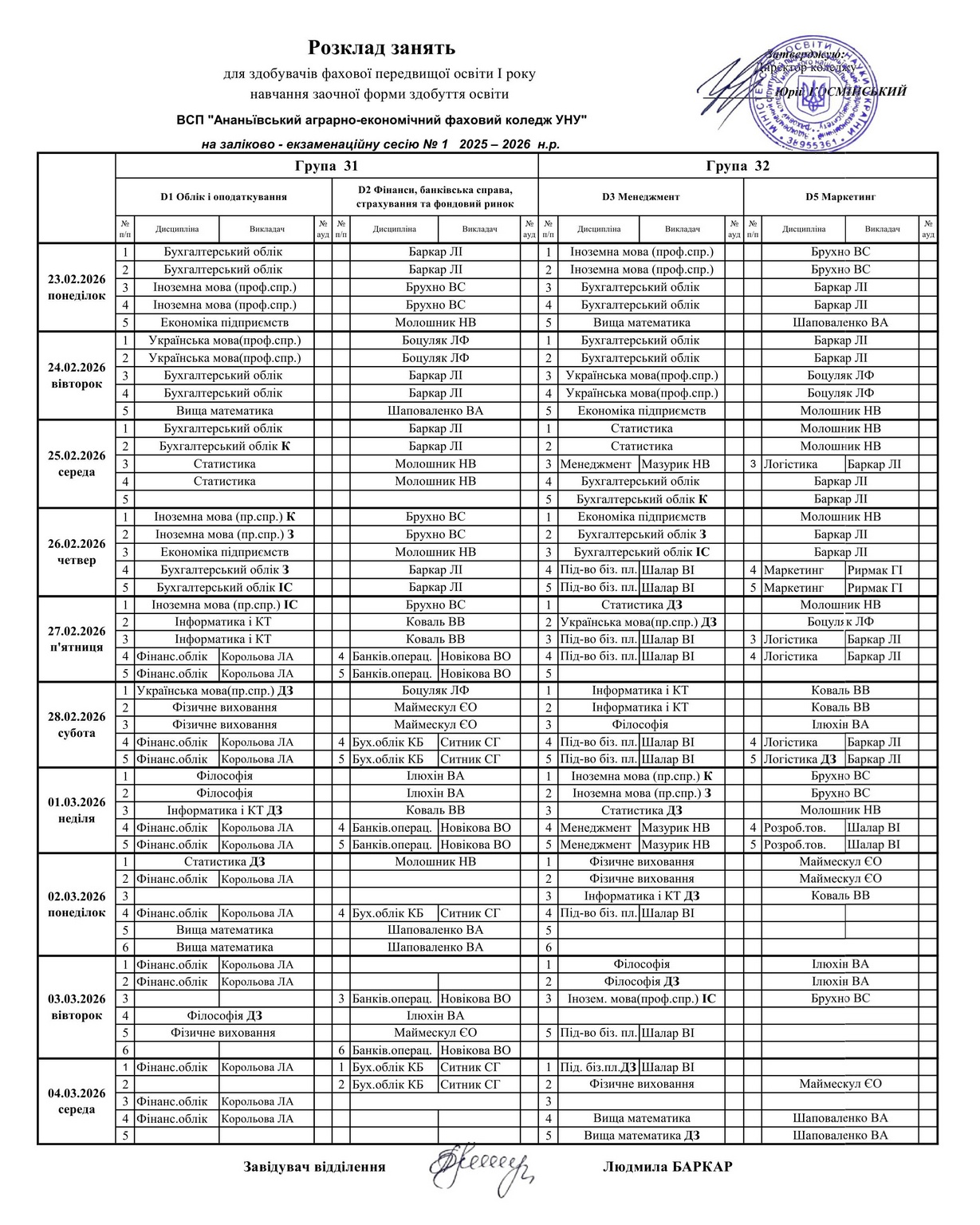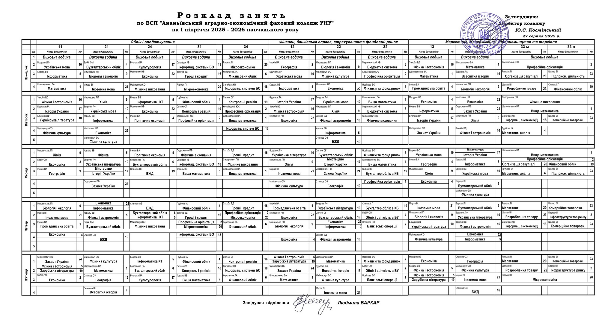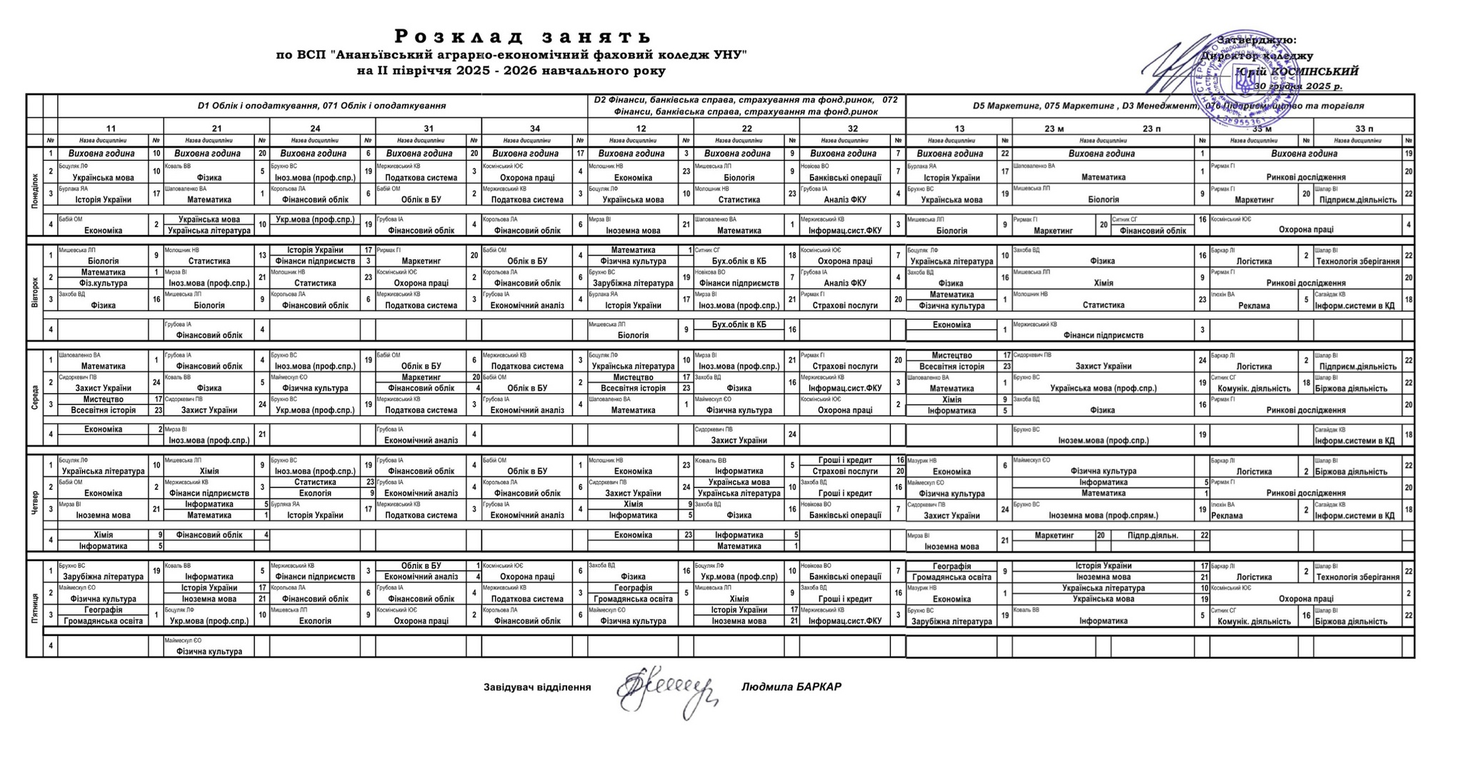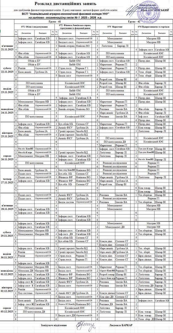 Розклад занять на І піврічя 2025-2026 н.рік