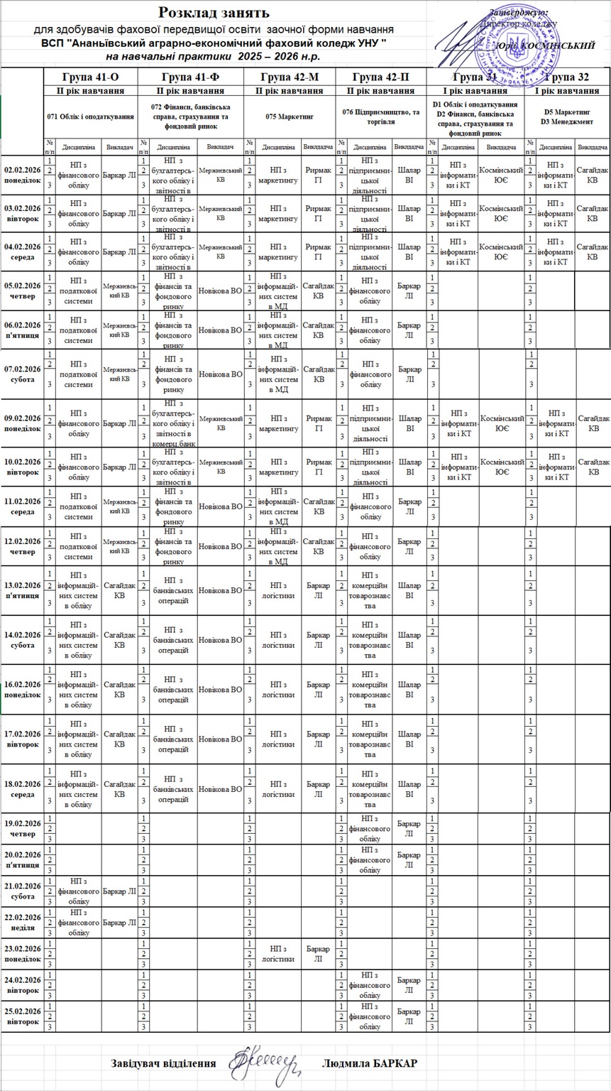 Розклад занять на ІІ піврічя 2025-2026 н.рік